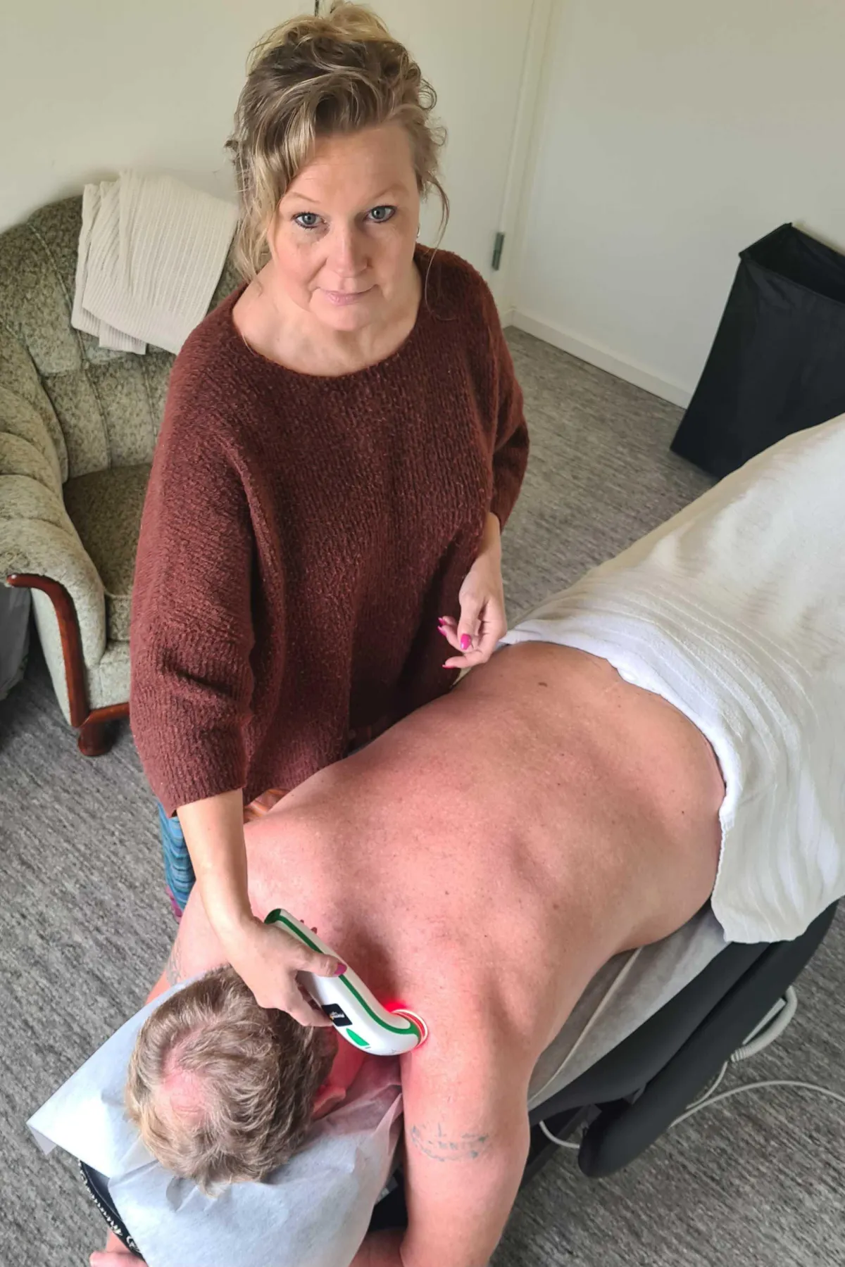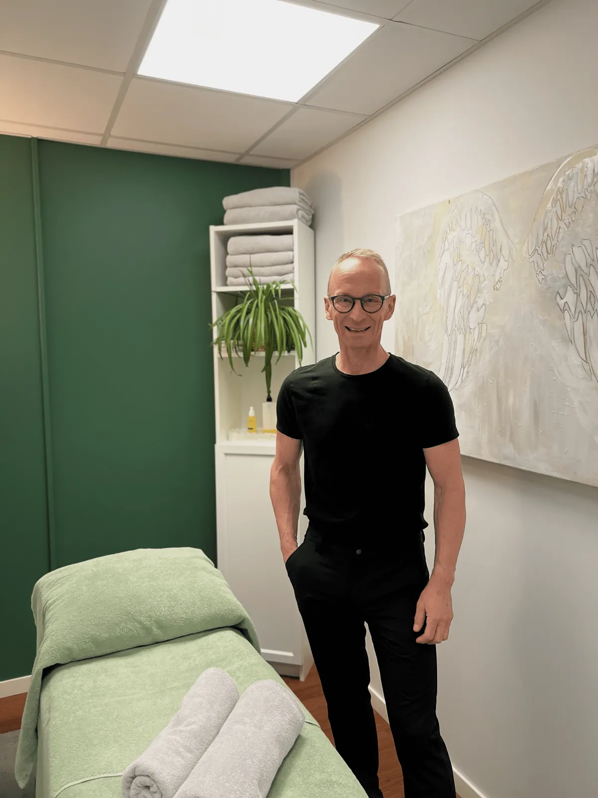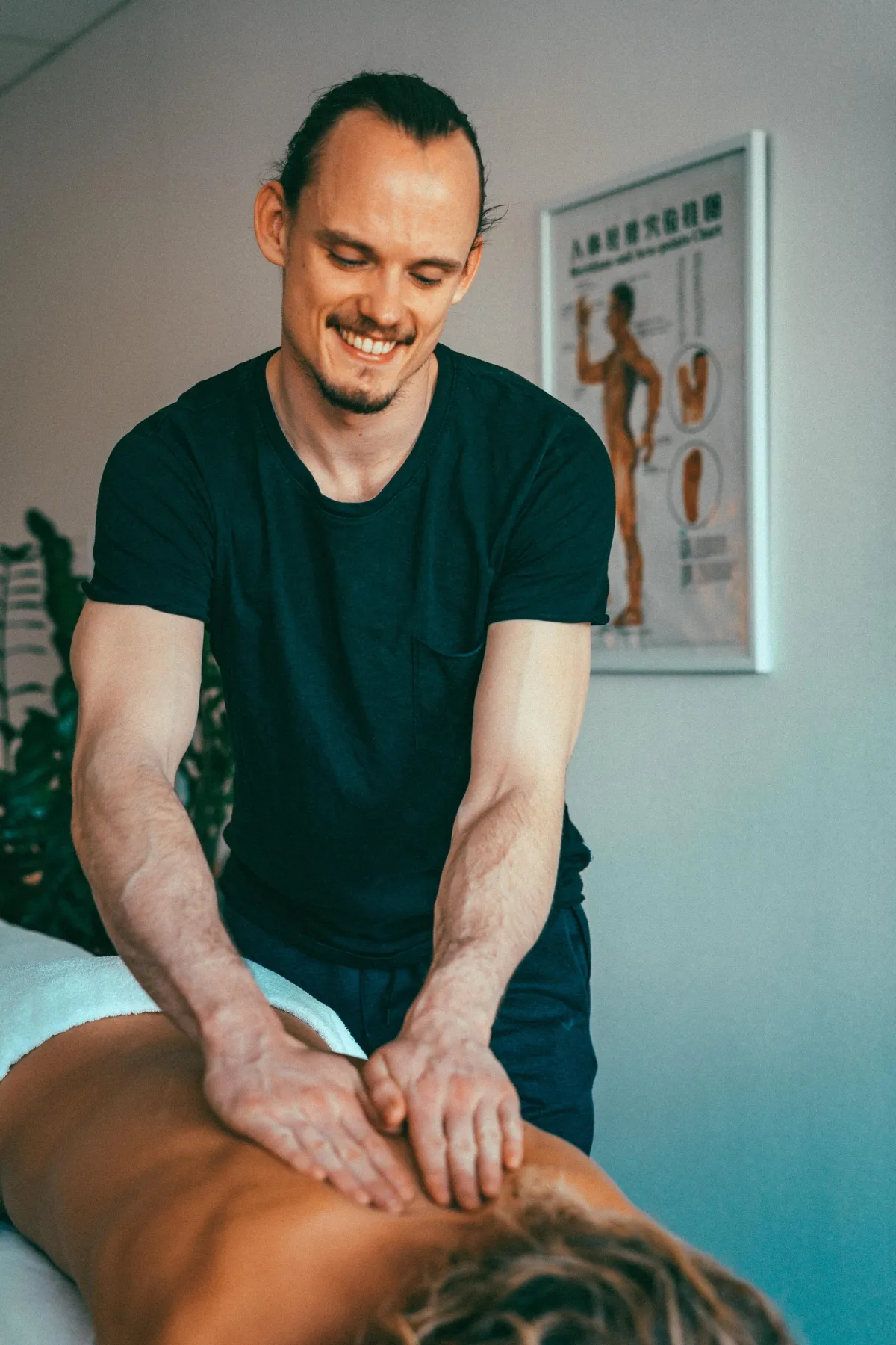 En tilfreds fysioterapeut og massageterapeut.