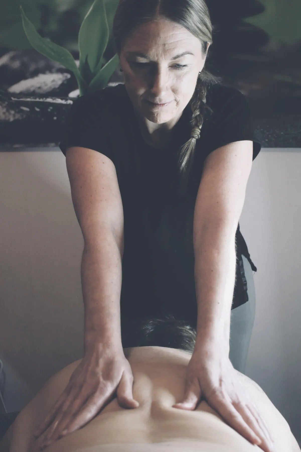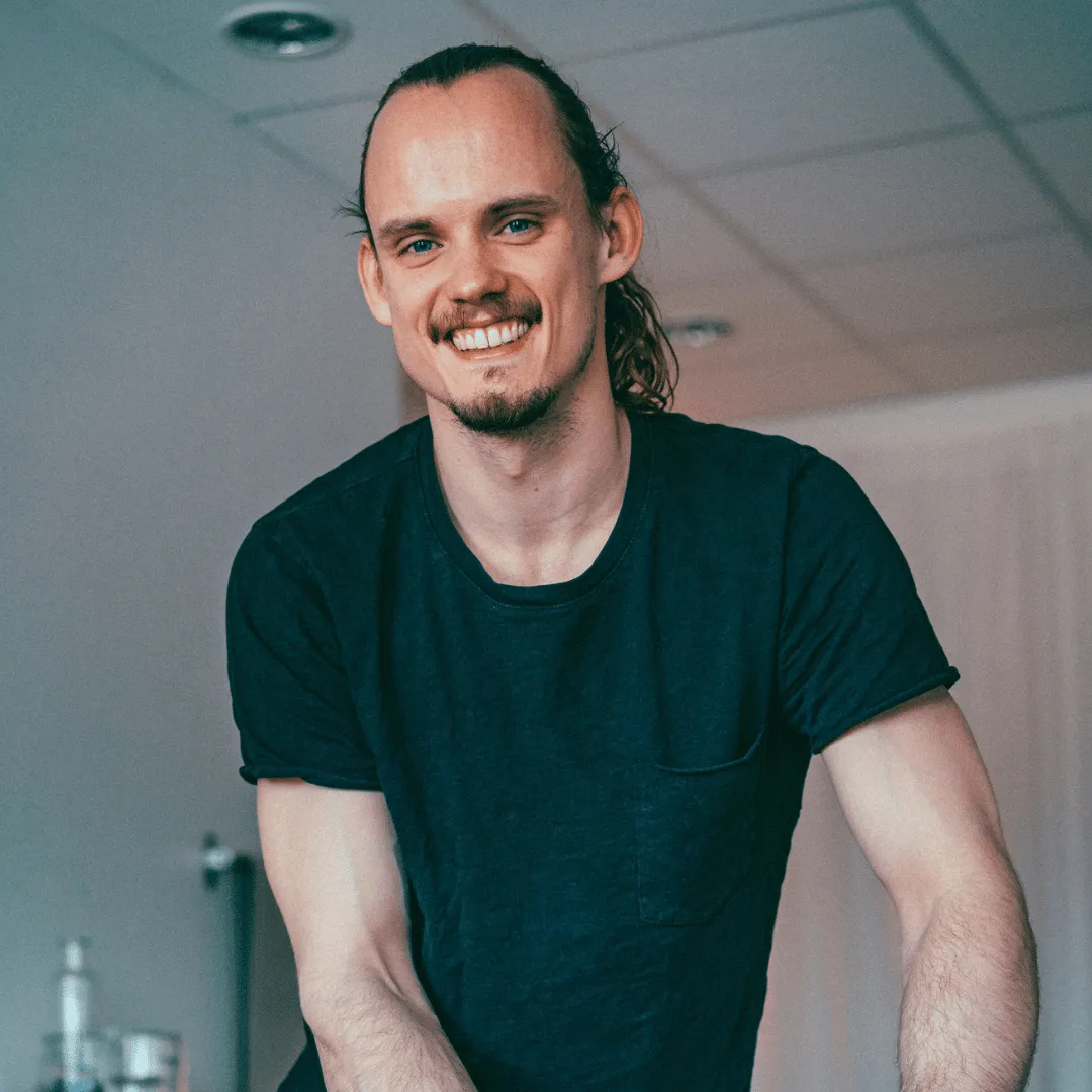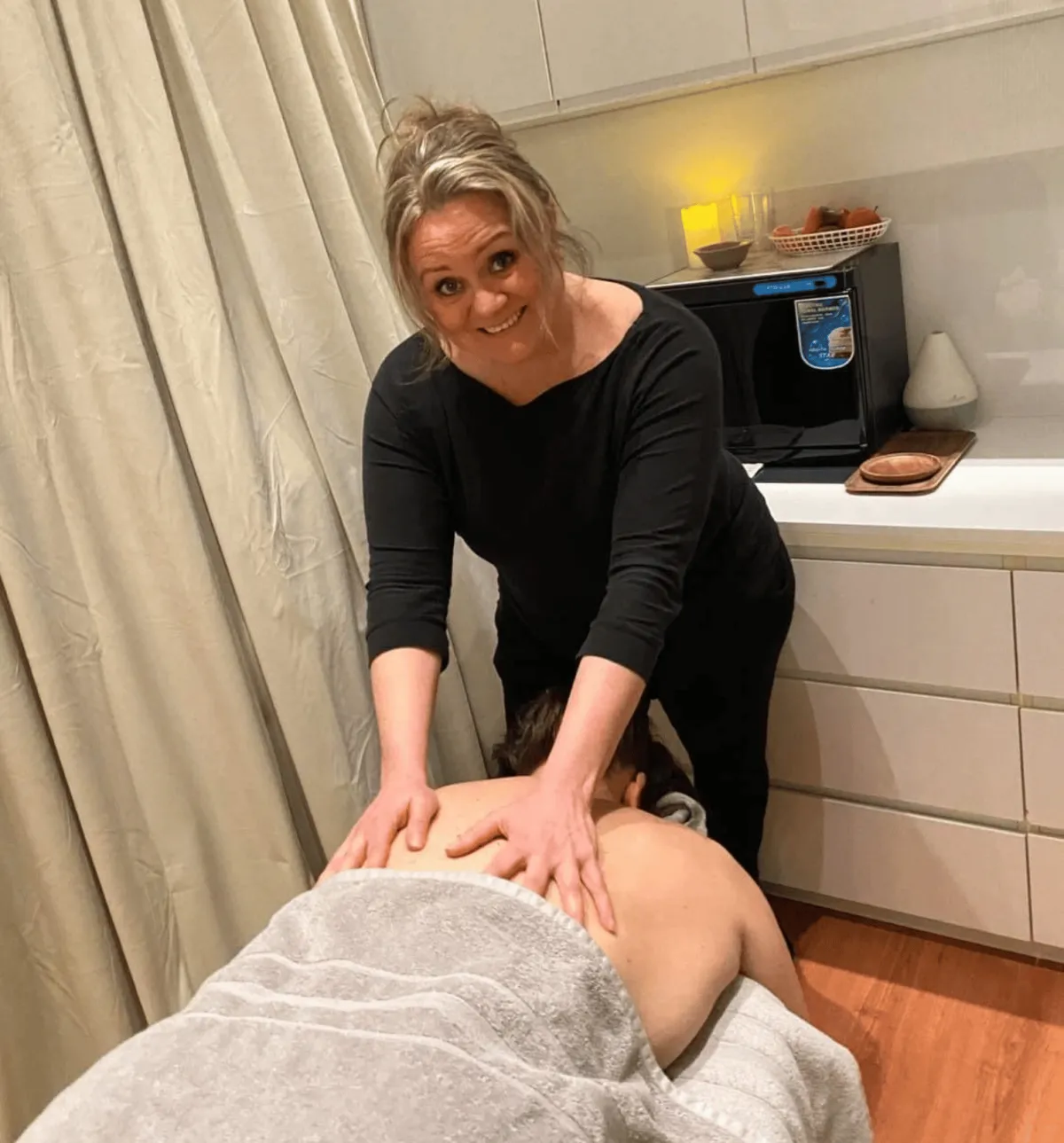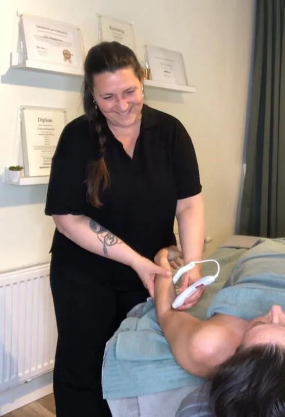 En tilfreds fysioterapeut og massageterapeut.